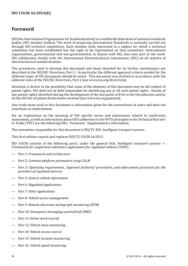 Keywords: ISO 15638-16, vehicle speed monitoring, TARV, intelligent transport systems, vehicle telematics, regulated vehicles, IVS, data exchange, quality of service, ASN.1, conformance.
