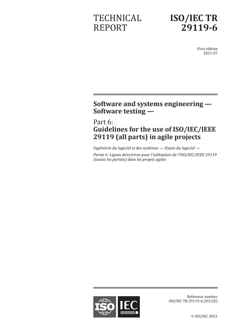 ISO/IEC TR 29119-6:2021 - Software and systems engineering — Software testing — Part 6: Guidelines for the use of ISO/IEC/IEEE 29119 (all parts) in agile projects Released:7/15/2021