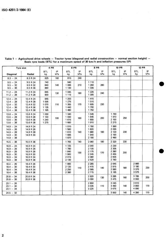 ISO 4251-2:1984 is a standard published by the International Organization for Standardization (ISO). Its full title is "Tyres and rims (existing series) for agricultural tractors and machines — Part 2: Tyre load ratings". This standard covers: Tyres and rims (existing series) for agricultural tractors and machines — Part 2: Tyre load ratings