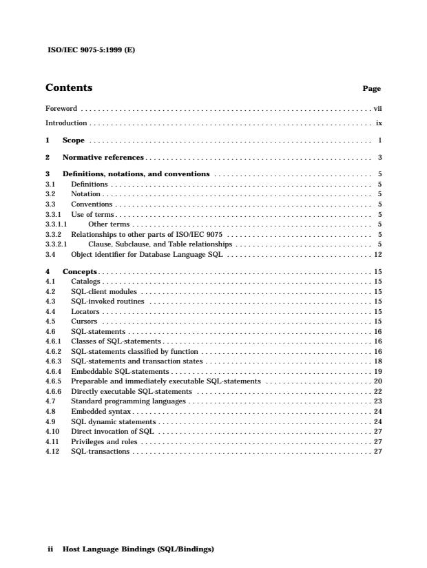ISO/IEC 9075-5:1999 is a standard published by the International Organization for Standardization (ISO). Its full title is "Information technology — Database languages — SQL — Part 5: Host Language Bindings (SQL/Bindings)". This standard covers: Information technology — Database languages — SQL — Part 5: Host Language Bindings (SQL/Bindings)