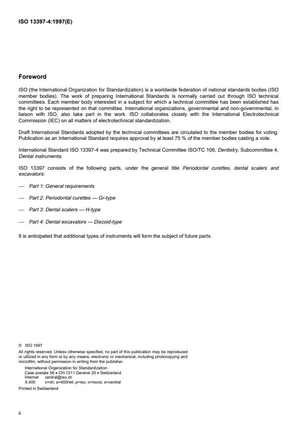 ISO 13397-4:1997 is a standard published by the International Organization for Standardization (ISO). Its full title is "Periodontal curettes, dental scalers and excavators — Part 4: Dental excavators — Discoid-type". This standard covers: Periodontal curettes, dental scalers and excavators — Part 4: Dental excavators — Discoid-type