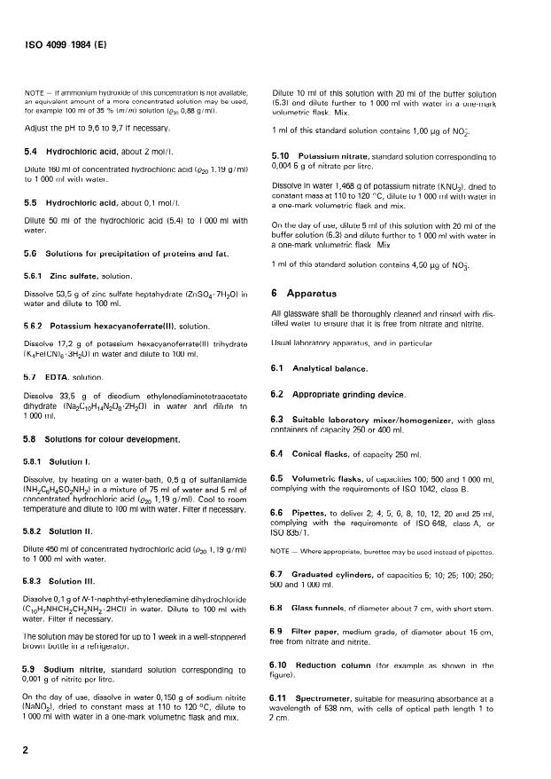 ISO 4099:1984 is a standard published by the International Organization for Standardization (ISO). Its full title is "Cheese — Determination of nitrate and nitrite contents — Method by cadmium reduction and photometry". This standard covers: Describes a method suitable for hard, semi-hard and soft cheeses of various ages and for processed cheese. The principle is based on extraction of the cheese with warm water, precipitation of the fat and proteins, filtration and reduction of the nitrate in a portion of the filtrate to nitrite by means of copperized cadmium. The detection limits of the method are 5 mg of nitrate per kilogram and 0,5 mg of nitrite per kilogram.