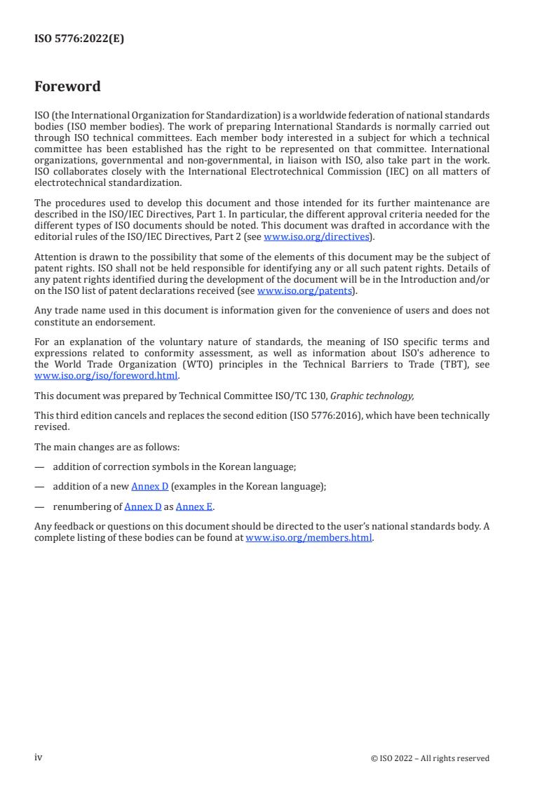 ISO 5776:2022 - Graphic technology - Symbols for text proof correction - is the third edition of the international standard that defines a unified set of proof-correction symbols for use in copy preparation and proofreading. Applicable to manuscripts, typescripts, printer’s proofs and electronic proofs (PDFs), the standard covers symbol sets for alphabetic languages, logographic languages (e.g., Chinese, Japanese) and an alphabetic + syllabary language (Korean). It excludes symbols for mathematical texts and colour illustrations. The 2022 edition updates previous editions (including ISO 5776:1983 and the 2016 edition) and adds Korean correction symbols and Annex D with examples.