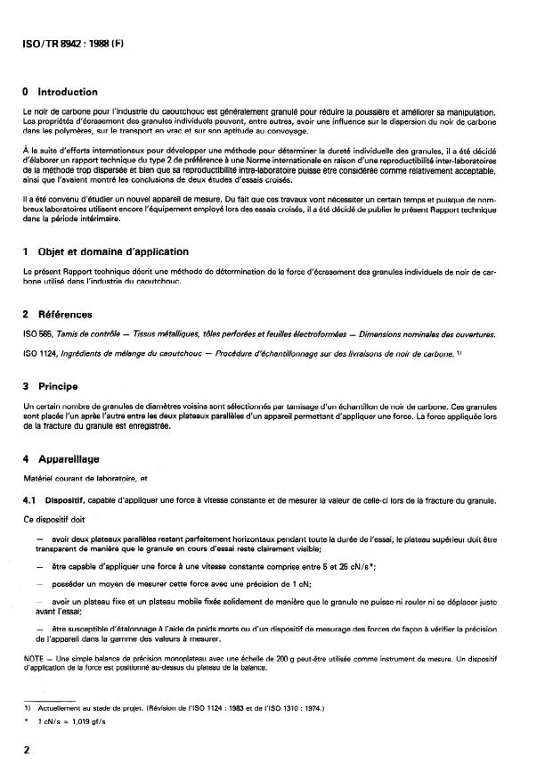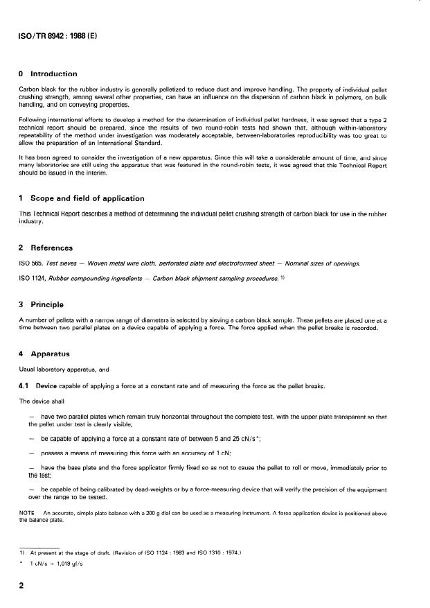 ISO/TR 8942:1988 is a technical report published by the International Organization for Standardization (ISO). Its full title is "Rubber compounding ingredients — Carbon black — Determination of individual pellet crushing strength". This standard covers: Defines the method as an interim method because the reproducibility between various laboratories is still too different. The crushing strength of individual pellets can affect the dispersion of carbon black in polymers, on bulk handling, and on conveying properties.
