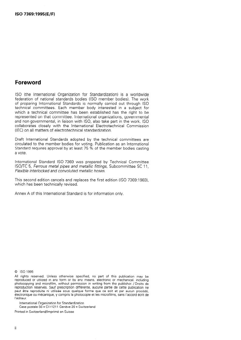 ISO 7369:1995 is a standard published by the International Organization for Standardization (ISO). Its full title is "Pipework — Flexible metallic hoses — Vocabulary of general terms". This standard covers: Defines current terms concerning flexible metallic hoses, flexible metallic hose assemblies and accessories. Replaces the first edition, which has been technically revised.