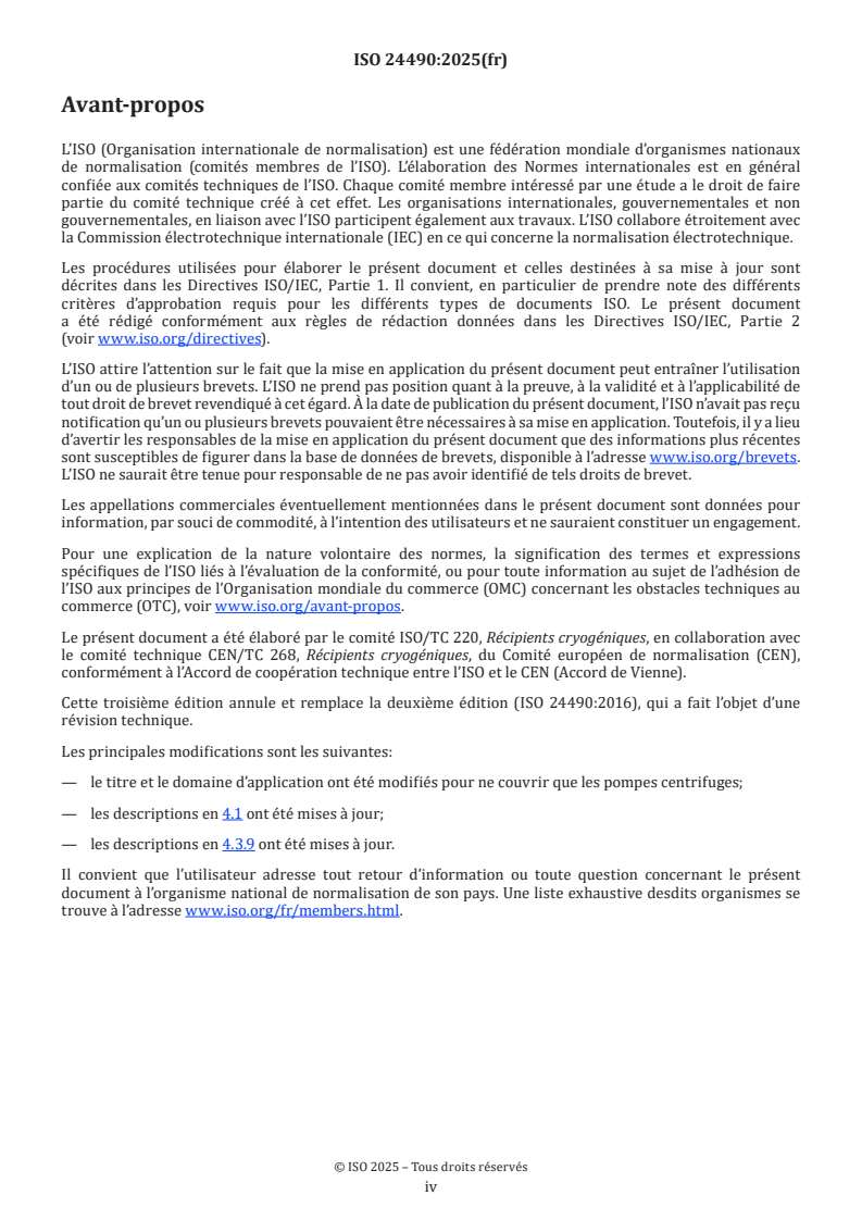 ISO 24490:2025 is a standard published by the International Organization for Standardization (ISO). Its full title is "Cryogenic vessels - Centrifugal pumps for cryogenic service". This standard covers: This document specifies the minimum requirements for the design, manufacture and testing of centrifugal pumps for cryogenic service. This document does not apply to reciprocating pumps. This document also gives guidance on the design of installations. It does not specify requirements for operation or maintenance. NOTE For general requirements for materials used in cryogenic fluid service, see ISO 21029-1, ISO 20421-1 or ISO 21009-1.