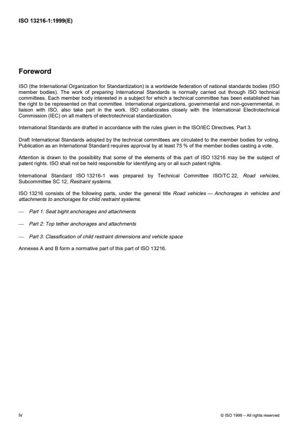 ISO 13216-1:1999 is an International Organization for Standardization (ISO) standard that defines a universal system for seat bight anchorages and attachments used to secure child restraint systems (CRS) in road vehicles. Often associated with the ISOFIX concept, this part specifies the dimensions, location, installation and static strength requirements of rigid anchorages intended for child restraints for children up to 22 kg. Annex A covers interim semi‑rigid vehicle anchorages and Annex B covers optional non‑rigid CRS attachments.