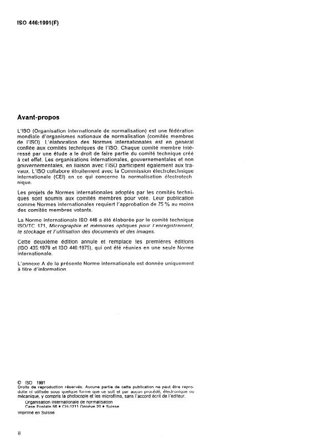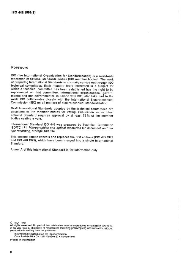 ISO 446:1991 is a standard published by the International Organization for Standardization (ISO). Its full title is "Micrographics — ISO character and ISO test chart No. 1 — Description and use". This standard covers: Applies to the quality testing of microimages produced with a given micrographic system and allows to determine the potential legibility of documents recorded with that system. Annex A gives optional features for ISO test chart No. 1. This second edition cancels and replaces the first editions (ISO 435:1975 and ISO 446:1975), which have been merged into a single International Standard.