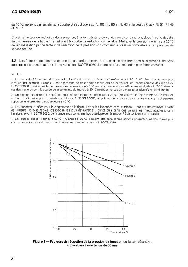 ISO 13761:1996 - Tubes et raccords en matieres plastiques -- Facteurs de réduction de pression des canalisations en polyéthylene utilisées a des températures supérieures a 20 degrés C