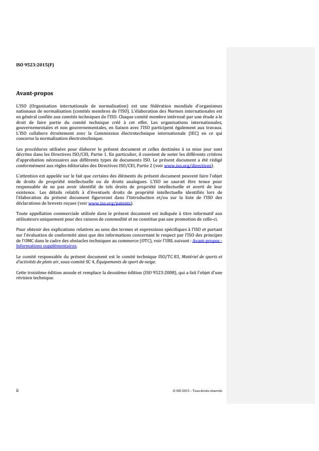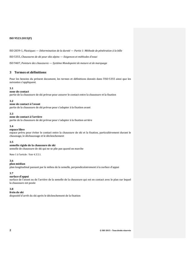 ISO 9523:2015 specifies the dimensions and characteristics of the interface, requirements, test methods, and marking of ski-boots with a rigid sole which are used with current systems of touring ski-bindings with attachment at the boot toe and boot heel, the proper release function of which depends on the dimensions and design of the interfaces. For ski-binding systems that function irrespective of the sole shape or that have different requirements for the sole dimensions, it is not always necessary for the ski-boot soles to comply with this International Standard in order to achieve the desired degree of safety. ISO 9523:2015 is applicable to ski-boots of sizes 15,0 and larger in the Mondopoint system. It is applicable to rigid touring boots. Boots with softer shells like Telemark boots are excluded as they do not have the necessary shell stability to act as part of the release systems.