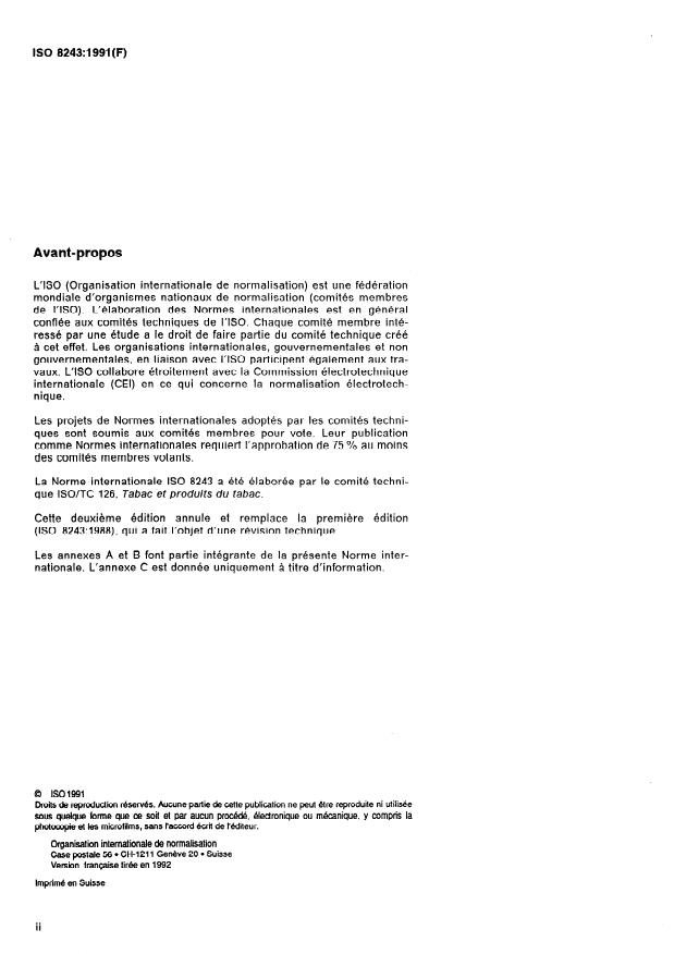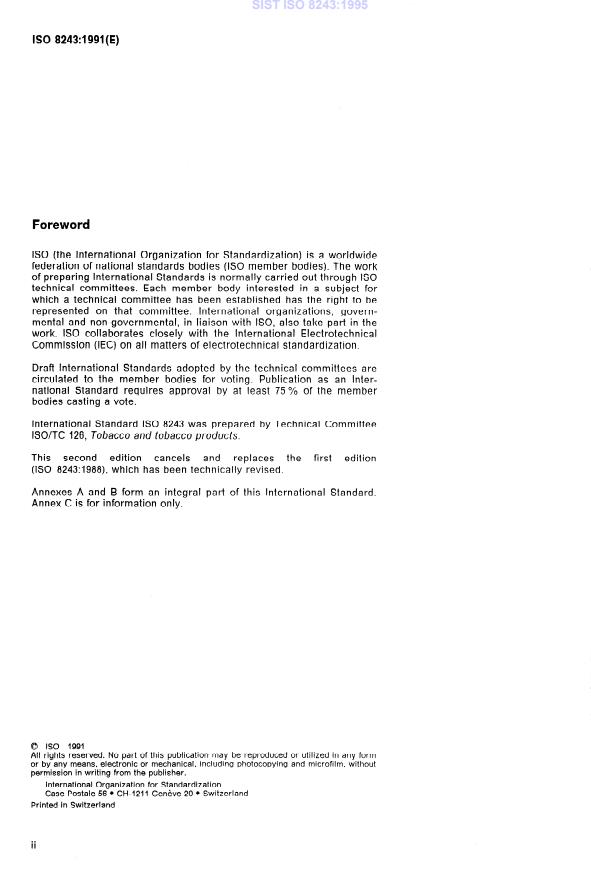 ISO 8243:1991 is a standard published by the International Organization for Standardization (ISO). Its full title is "Cigarettes — Sampling". This standard covers: Specifies two methods of sampling a population of cigarettes manufactured for sale for the preparation of samples. This second edition cancels and replaces the first edition (1988). Annexes A and B form an integral part of this standard. Annex C is for information only.