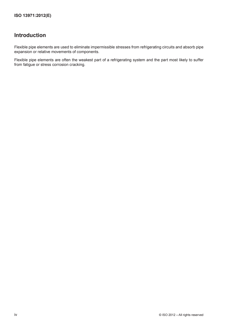 ISO 13971:2012 describes requirements, design and installation of flexible pipe elements (e.g. metallic flexible pipe, metallic flexible tube, vibration isolator, expansion joint) and non-metallic tube used in the refrigerant circuits of refrigerating systems and heat pumps. ISO 13971:2012 also describes the requirements to qualify the tightness and permeability of non-metallic tubes (e.g. plastic) used in evaporating and/or condensing sides of refrigerating systems and heat pumps. ISO 13971:2012 does not apply to flexible pipes that are only occasionally stressed beyond the elastic limit (e.g. during repair work), or to joints that are free to rotate or hinge.