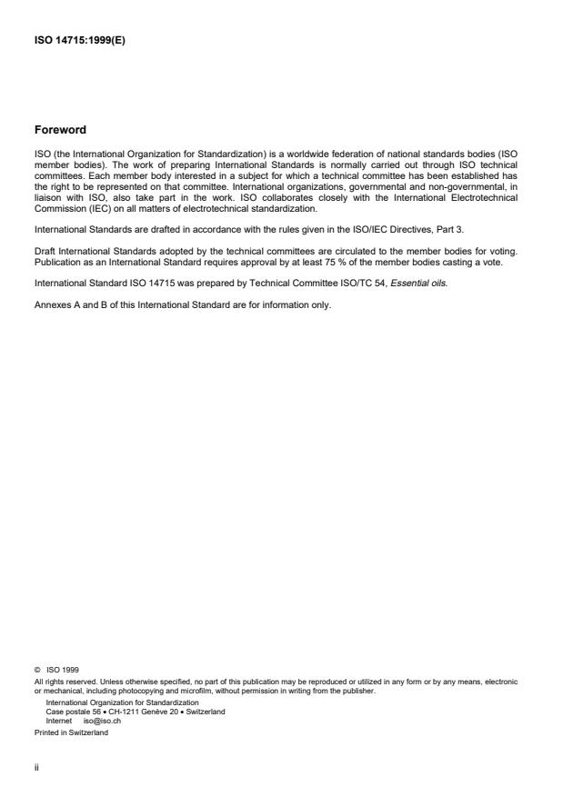 International Standard ISO 14715 was prepared by Technical Committee ISO/TC 54, Essential oils.