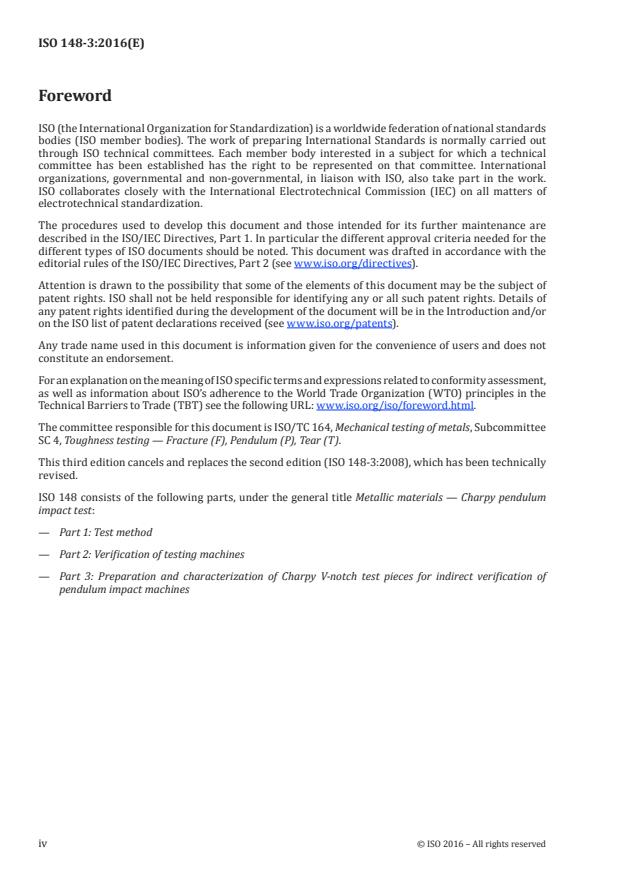 ISO 148-3:2016 is a standard published by the International Organization for Standardization (ISO). Its full title is "Metallic materials - Charpy pendulum impact test - Part 3: Preparation and characterization of Charpy V-notch test pieces for indirect verification of pendulum impact machines". This standard covers: ISO 148-3:2016 specifies the requirements, preparation and methods for qualifying test pieces used for the indirect verification of pendulum impact testing machines in accordance with ISO 148‑2. It specifies notched test pieces with nominal dimensions identical to those specified in ISO 148‑1; however, the tolerances are more stringent. NOTE 1 The chemical composition or heat treatment, or both, are varied according to the energy level desired. NOTE 2 Reference test pieces are qualified on reference pendulum impact testing machines which are also described in this part of ISO 148.
