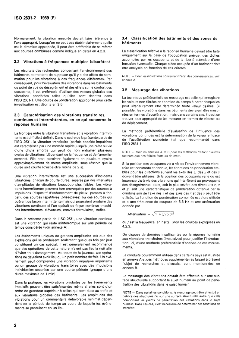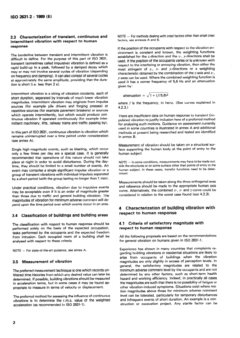 ISO 2631-2:1989 is a standard published by the International Organization for Standardization (ISO). Its full title is "Evaluation of human exposure to whole-body vibration - Part 2: Continuous and shock-induced vibrations in buildings (1 to 80 Hz)". This standard covers: General guidance is given on human response to building vibrations. Includes weighting curves of frequency response for equal annoyance of humans together with measurement methods to be used. Is concerned only with tactile perception and does not take into account auditory perception of radiated sound.