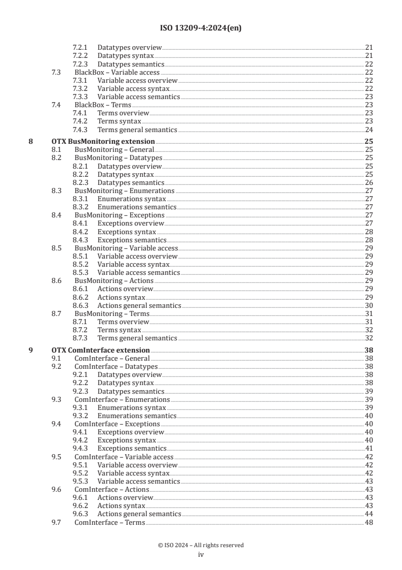 ISO 13209-4:2024 - "Road vehicles - Open Test sequence eXchange format (OTX) - Part 4: Expanded extensions interface definition" defines additional extension requirements and an exhaustive data-model specification for OTX. Building on the use cases in ISO 13209-1, this second-edition International Standard (2024-11) specifies syntax and semantics for OTX extension features using UML class diagrams and XML schemas (syntax) and UML activity diagrams plus prose (semantics). It establishes rules that ensure consistent interpretation of OTX documents that include extended functionality.
