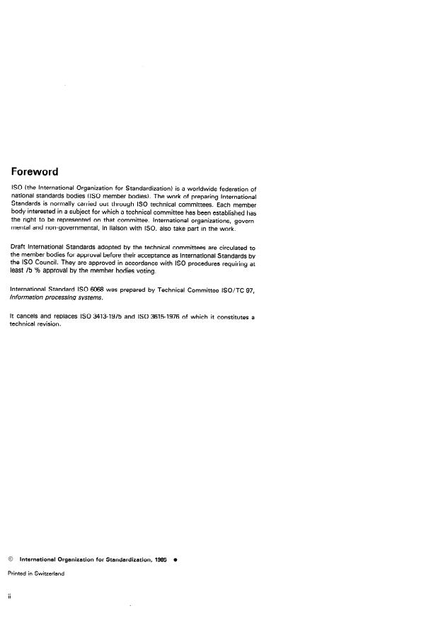 ISO 6068:1985 is a standard published by the International Organization for Standardization (ISO). Its full title is "Information processing - Recording characteristics of instrumentation magnetic tape (including telemetry systems) - Interchange requirements". This standard covers: Includes the tape and recorder/reproducer characteristics and modes of recording to enable users of different systems to interchange information recorded on instrumentation magnetic tape. Annexes A, B, C, D, and E contain recommended procedure for testing recorder/reproducer systems, magnetic tape recorder/reproducer information and use criteria, additional nates for the testing of magnetic tape recorder/reproducer, PCM standards - additional information and recommendations -, and use criteria for frequency division multiplexing, respectively.