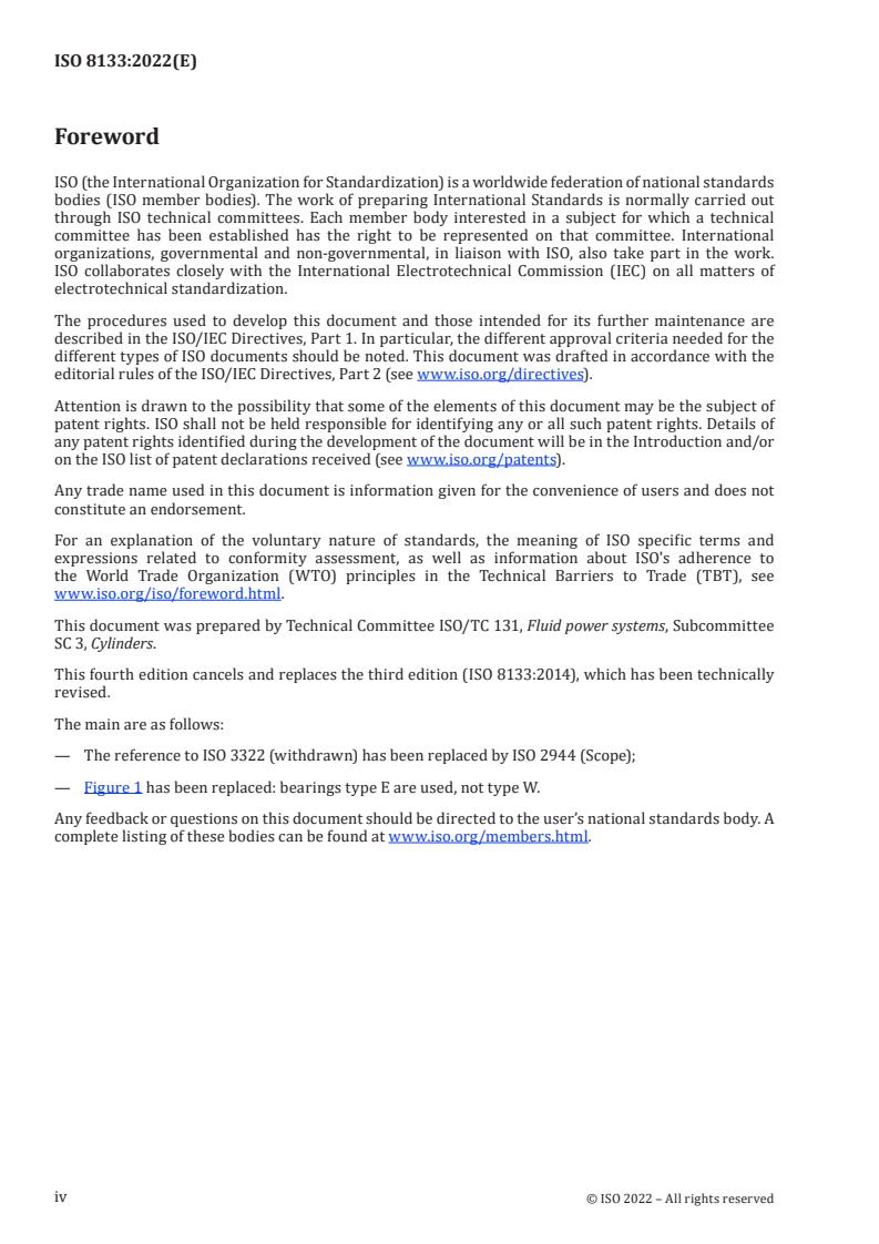 ISO 8133:2022 is a standard published by the International Organization for Standardization (ISO). Its full title is "Hydraulic fluid power - Mounting dimensions for accessories for single rod cylinders, 16 MPa (160 bar) compact series". This standard covers: This document specifies the mounting dimensions required for interchangeability of accessories for 16 MPa (160 bar) compact cylinders conforming to ISO 6020‑2. The accessories have been designed specifically for use with cylinders manufactured in accordance with ISO 6020‑2, but this does not limit their application[1]. This document covers the following accessories, identified in accordance with ISO 6099: - AP6 - rod eye spherical, female thread (see Figure 1 and Table 1); - AB5 - clevis bracket, spherical eye, in angle (see Figure 2 and Table 2); - AA6-L - pivot pin, spherical bearing, locking plate (see Figure 3 and Table 3); - AL6 - locking plate for pivot pin (see Figure 4 and Table 4); - AP2 - rod clevis, female thread (see Figure 5 and Table 5); - AP4 - rod eye plain, female thread (see Figure 6 and Table 6); - AB2 - eye bracket (see Figure 7 and Table 7); - AB4 - clevis bracket, straight (see Figure 8 and Table 8); - AA4-S - pivot pin, plain (split pins) (see Figure 9 and Table 9); - AA4-R - pivot pin, plain (rings) (see Figure 10 and Table 10); - AT4 - trunnion bracket (see Figure 11 and Table 11). These accessories are used on hydraulic cylinders for mechanically transmitting the cylinder force. The design of these accessories is based on the maximum forces resulting from the specified internal diameters of the cylinders and pressures according to ISO 3320 and ISO 2944. This document only applies to the dimensional criteria of products manufactured in conformity with this document; it does not apply to their functional characteristics. [1] 1 bar = 0,1 MPa = 105 Pa; 1 MPa = 1 N/mm2