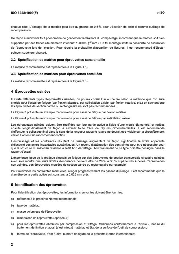 ISO 3928:1999 - Matériaux métalliques frittés, a l'exclusion des métaux-durs -- Éprouvettes pour essais de fatigue