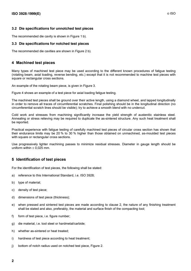 ISO 3928:1999 - Sintered metal materials, excluding hardmetals -- Fatigue test pieces