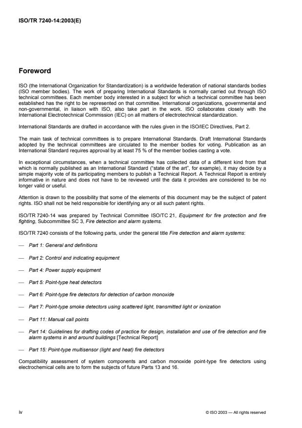 ISO/TR 7240-14:2003 is a technical report published by the International Organization for Standardization (ISO). Its full title is "Fire detection and alarm systems — Part 14: Guidelines for drafting codes of practice for design, installation and use of fire detection and fire alarm systems in and around buildings". This standard covers: ISO/TR 7240-14:2003 is intended to be used as a general guideline for the preparation of a code of practice for the design, installation and use of a fire detection and fire alarm system. ISO/TR 7240-14:2003 describes the format, the table of contents and the objectives of the different clauses of the code of practice.