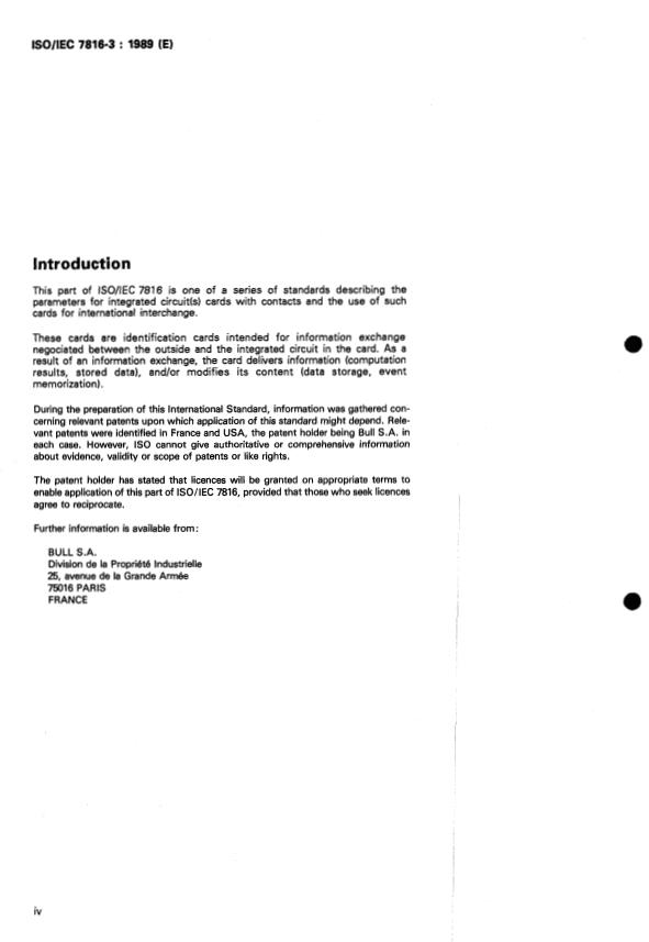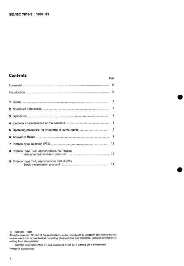 ISO/IEC 7816-3:1989 is a standard published by the International Organization for Standardization (ISO). Its full title is "Identification cards — Integrated circuit(s) cards with contacts — Part 3: Electronic signals and transmission protocols". This standard covers: Identification cards — Integrated circuit(s) cards with contacts — Part 3: Electronic signals and transmission protocols