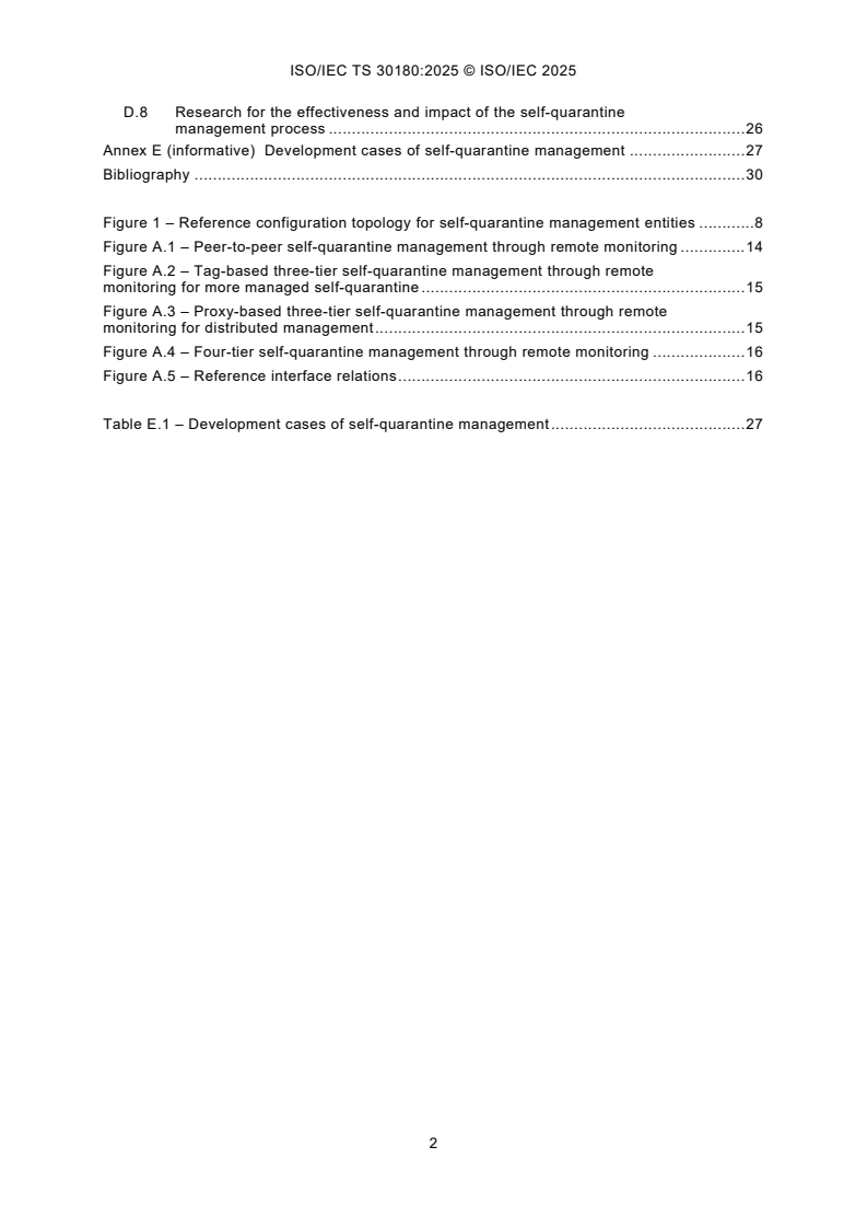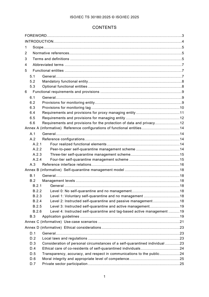 ISO/IEC TS 30180:2025 is a technical specification published by the International Organization for Standardization (ISO). Its full title is "Internet of Things (IoT) — Functional requirements to determine the status of self-quarantine through Internet of Things data interfaces". This standard covers: This document specifies the functional requirements of the following items to determine the status of self-quarantine through IoT data interfaces working over a set of hand-held devices, monitoring tag, and a management system: – functional requirements for monitoring entity and monitoring tag at a self-quarantine place; – functional requirements for managing entity and proxy managing entity at the management side; and – functional requirements for the protection of the self-quarantine status and the privacy information.
