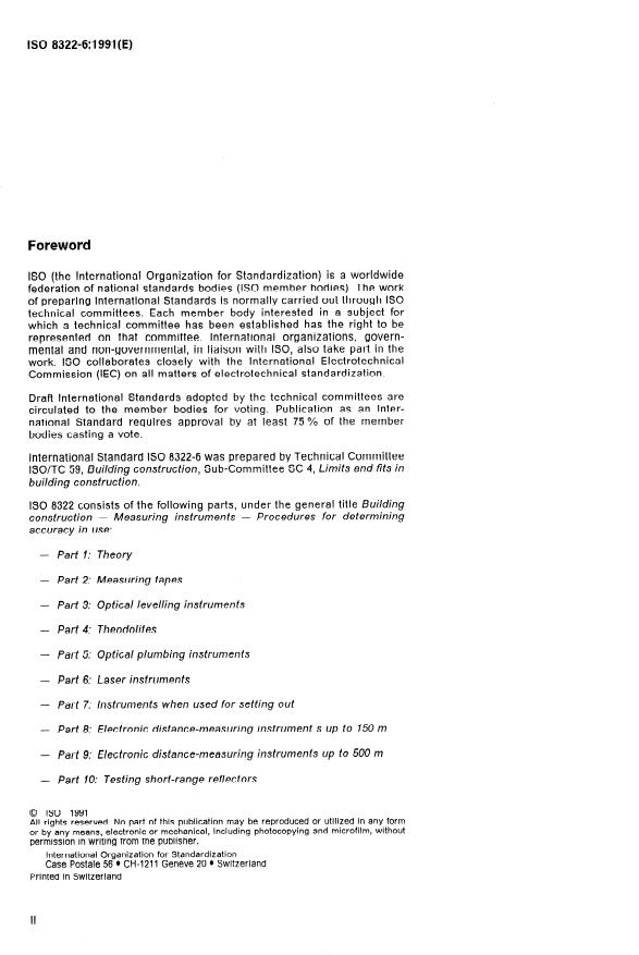 ISO 8322-6:1991 is a standard published by the International Organization for Standardization (ISO). Its full title is "Building construction — Measuring instruments — Procedures for determining accuracy in use — Part 6: Laser instruments". This standard covers: Specifies test procedures used to evaluate the precision in use of laser instruments and ancillary equipment for measurements of distances from a plane, a line or a specific gradient defined by a laser beam. Does not apply to land surveying purposes.