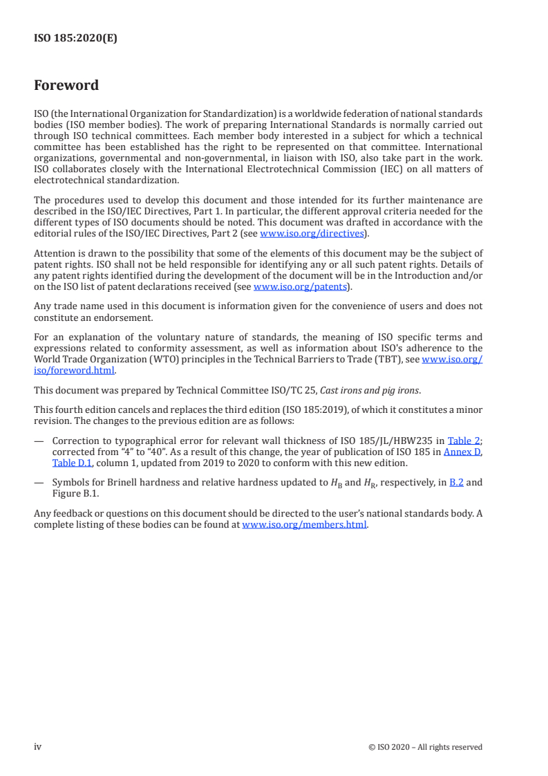 ISO 185:2020 is a document that outlines the classification of unalloyed and low-alloyed grey cast irons used for castings made in sand moulds or similar thermal behavior moulds. The document specifies the properties of grey cast irons based on their tensile strength, hardness, or a combination of both. It defines eight grades of grey cast iron based on tensile strength and six grades based on Brinell hardness. The document does not apply to grey cast irons used for pipes, pipe fittings, and continuous cast products, nor does it cover technical delivery conditions for grey iron castings. ISO/TR 10809-1 provides additional general information on the engineering properties of grey cast irons.