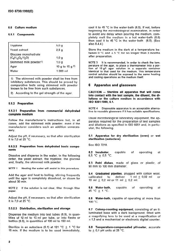 ISO 6730:1992 is a standard published by the International Organization for Standardization (ISO). Its full title is "Milk — Enumeration of colony-forming units of psychrotrophic micro-organisms — Colony-count technique at 6,5 degrees C". This standard covers: Specifies the principle, the diluents and culture medium, the apparatus and glassware, the sampling and procedure, the expression of results, the repeatability and the test report.