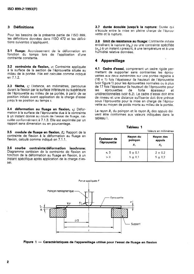 1.1 La présente partie de l'ISO 899 prescrit une méthode pour la détermination du fluage en flexion des plastiques sous forme d'éprouvettes normalisées dans des conditions spécifiées, telles qu'en matière de traitement préalable, température et humidité. Cette méthode s'applique uniquement aux poutres simples, supportées sans contrainte, et chargées au milieu de leur portée (méthode des trois pannes). 1.2 La méthode peut être utilisée avec des plastiques rigides et semi-rigides (voir ISO 472 pour les définitions), non renforcés, chargés et renforcés par des fibres sous forme de barreaux rectangulaires moulés directement ou prélevés sur des feuilles ou des objets moulés. NOTE 1 La méthode peut s'avérer inappropriée dans le cas de certaines matières renforcées par des fibres en raison des différences d'orientation de celles-ci. 1.3 La méthode peut permettre d'obtenir des données utiles pour la conception en ingénerie, la recherche et le développement. 1.4 Le fluage en flexion peut dépendre étroitement des différences existant en matière de dimensions et préparation des éprouvettes ainsi qu'en ce qui concerne l'environnement d'essai. L'histoire thermique de l'éprouvette peut également influencer profondément son comportement au fluage (voir annexe A). En conséquence, lorsque des résultats comparatifs précis sont requis, ces facteurs doivent être contrôlés avec soin. 1.5 Si les caractéristiques de fluage en flexion doivent être utilisées à des fins de concept 552ion en ingénierie, la sensibilité des plastiques impose la réalisation d'essais dans une large gamme de contraintes, durées et environnements. 1.6 La méthode peut s'avérer inappropriée pour déterminer le fluage en flexion des plastiques alvéolaires rigides. (Il importe d'examiner avec attention l'ISO 1209-1:1990, Plastiques alvéolaires rigides -- Essais de flexion -- Partie 1: Essai de flexion, et l'ISO 1209-2:1990, Plastiques alvéolaires rigides -- Essais de flexion -- Partie 2: Détermi