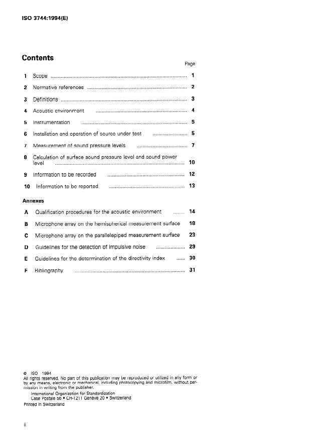 ISO 3744:1994 is a standard published by the International Organization for Standardization (ISO). Its full title is "Acoustics — Determination of sound power levels of noise sources using sound pressure — Engineering method in an essentially free field over a reflecting plane". This standard covers: Specifies a method of measurement. Gives requirements for the test environment and instrumentation, as well as techniques for obtaining the surface sound pressure level from which the sound power level of the source is calculated, leading to results which have a grade 2 accuracy.