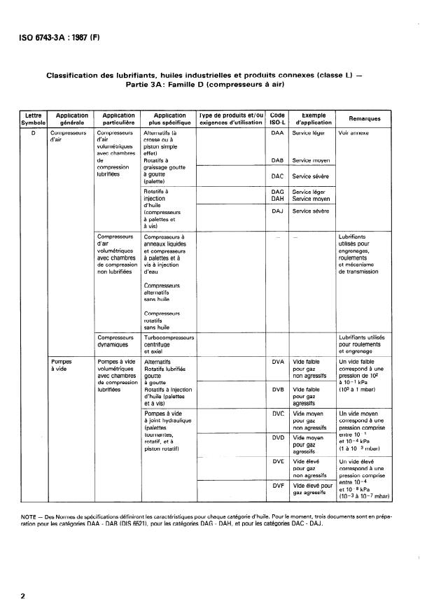Lubrifiants, huiles industrielles et produits connexes (classe L) — Classification — Partie 3A: Famille D (Compresseurs)