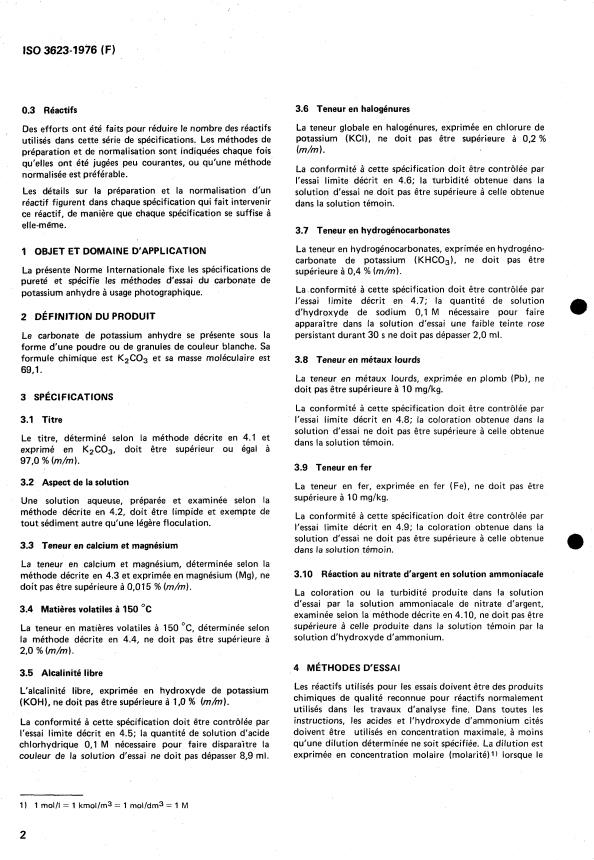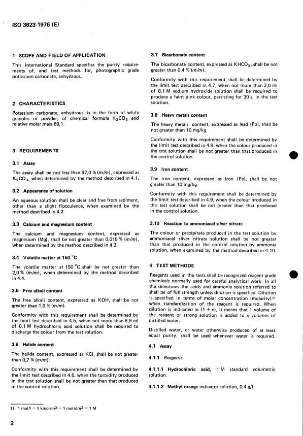 ISO 3623:1976 is a standard published by the International Organization for Standardization (ISO). Its full title is "Photographic grade potassium carbonate, anhydrous — Specification". This standard covers: Photographic grade potassium carbonate, anhydrous — Specification