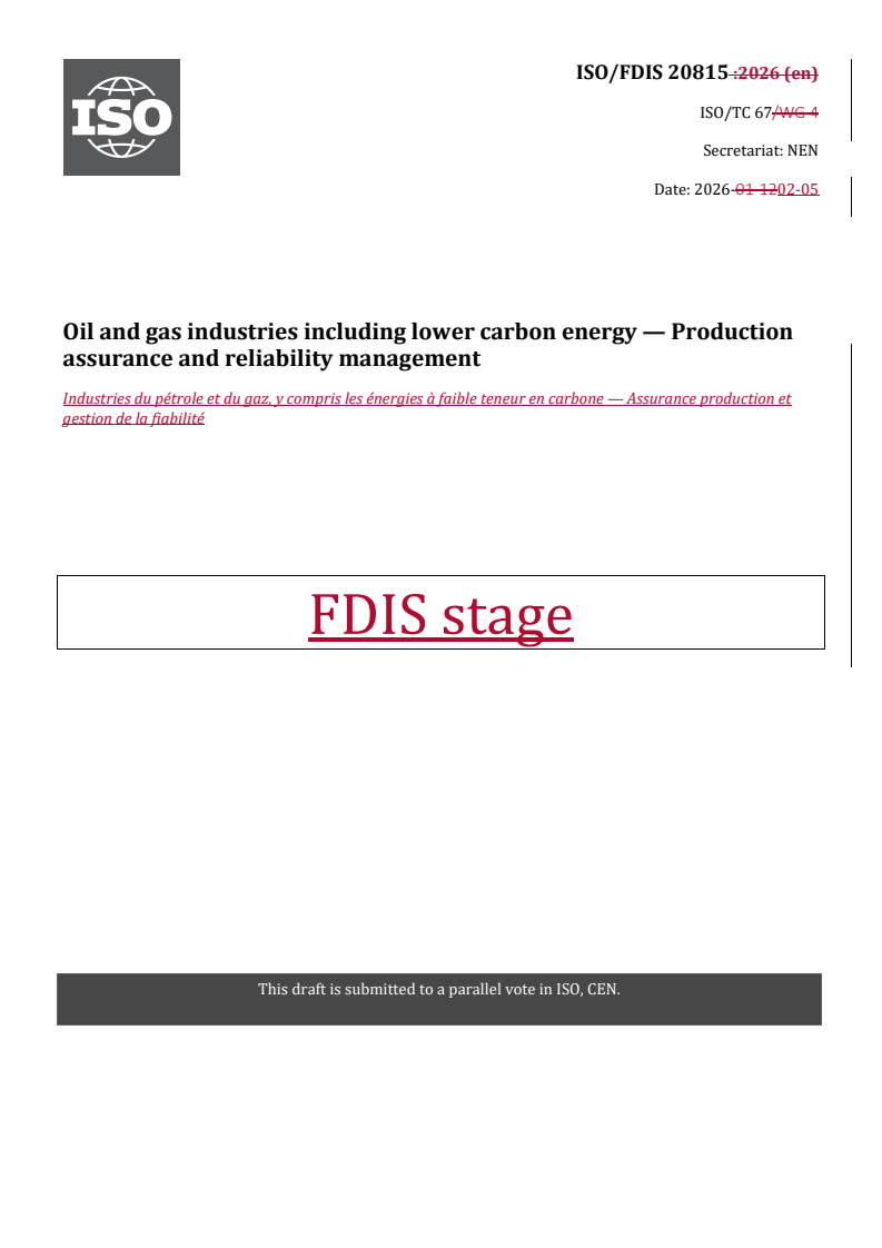 REDLINE ISO/FDIS 20815 - Oil and gas industries including lower carbon energy — Production assurance and reliability management Released:6. 02. 2026