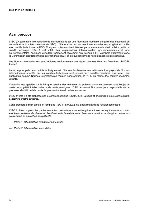 ISO 11810-1:2005 is applicable to disposable and reusable, as well as woven and non-woven materials used as surgical drapes and other patient protective covers which claim to be laser resistant. The purpose of ISO 11810-1:2005 is to provide a standardized method for testing and classifying surgical drapes and other patient protective covers with respect to laser-induced hazards. An appropriate classification system is given. It is not the purpose of ISO 11810-1:2005 to serve as a general fire safety specification, and as such, this standard does not cover other sources of ignition. It also does not cover the issue of laser-induced secondary ignition. All materials reflect portions of the beam and it is necessary for the user to decide whether specular reflectance may be a hazard. This measurement, however, is not covered in ISO 11810-1:2005.