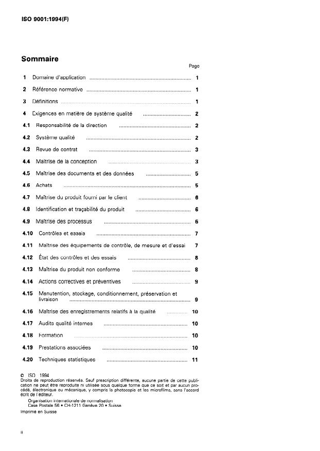 ISO 9001:1994 is a standard published by the International Organization for Standardization (ISO). Its full title is "Quality systems - Model for quality assurance in design, development, production, installation and servicing". This standard covers: La présente Norme internationale spécifie des exigences en matière de système qualité à utiliser lorsque l'aptitude d'un fournisseur à concevoir et fournir un produit conforme doit être démontrée. Les exigences spécifiées visent en premier lieu la satisfaction du client, par la prévention des non-conformités à tous les stades, depuis la conception jusqu'aux prestations associées. La présente Norme internationale est applicable lorsque a) de la conception est exigée et les exigences relatives au produit sont formulées principalement en termes de résultats ou lorsqu'il est nécessaire d'établir ces exigences, et b) la confiance dans la conformité du produit peut être obtenue par une démonstration adéquate des aptitudes d'un fournisseur en matière de conception, développement, production, installation et prestations associées. NOTE 1 Pour les références informatives, voir annexe A.