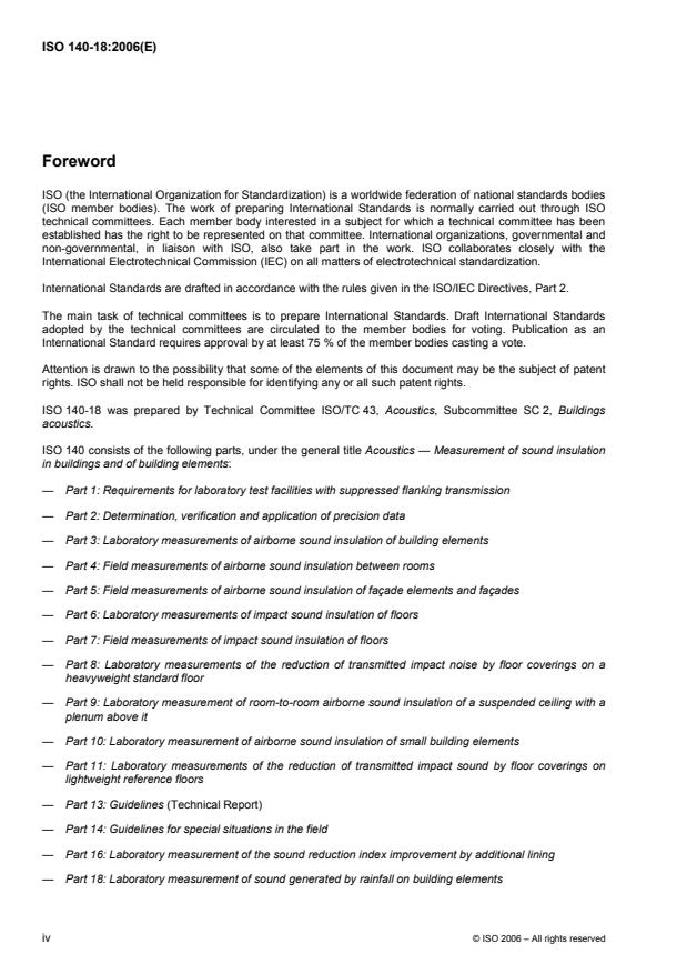 ISO 140-18:2006 is a standard published by the International Organization for Standardization (ISO). Its full title is "Acoustics — Measurement of sound insulation in buildings and of building elements — Part 18: Laboratory measurement of sound generated by rainfall on building elements". This standard covers: ISO 140-18:2006 specifies a laboratory method of measurement of the impact sound insulation of roofs, roof/ceiling systems and skylights excited by artificial rainfall. The results obtained can be used for assessing the noise to be produced by rainfall on a given building element in the room or space below. The results can also be used to compare rainfall sound insulation capabilities of building elements and to design building elements with appropriate rainfall sound insulation properties. ISO 140-18:2006 is based on measurements with artificial raindrops under controlled conditions using a water tank in a laboratory test facility in which flanking sound transmission is suppressed. Measurements using real rain, although a useful means for validation purposes, are not included because of the variable, unpredictable and intermittent nature of real rain. Other mechanical simulation methods under investigation by researchers are not sufficiently well developed at present to adequately simulate real rain both in terms of sound levels and spectra generated.