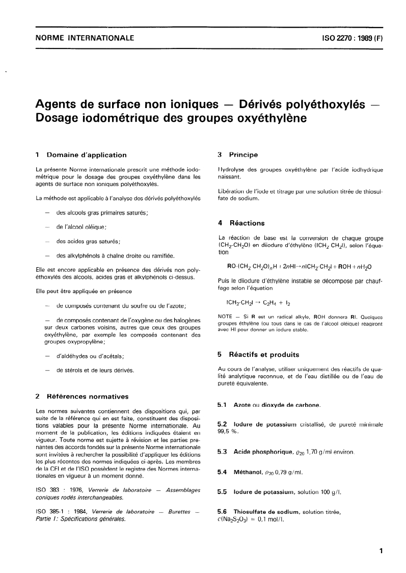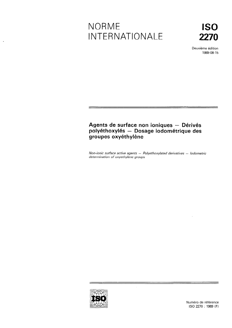 ISO 2270:1989 - Agents de surface non ioniques — Dérivés polyéthoxylés — Dosage iodométrique des groupes oxyéthylène/17/1989