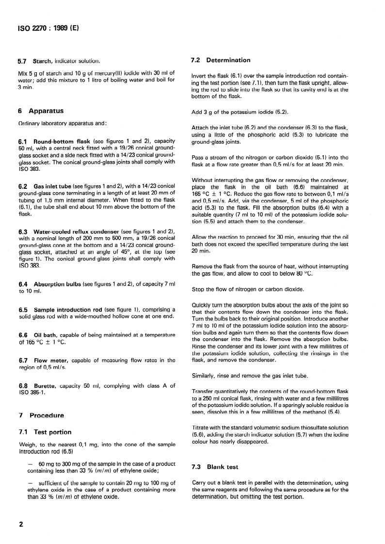ISO 2270:1989 is a standard published by the International Organization for Standardization (ISO). Its full title is "Non-ionic surface active agents — Polyethoxylated derivatives — Iodometric determination of oxyethylene groups". This standard covers: The sample is hydrolyzed by nascent hydroiodic acid. The iodine liberated is titrated with a standard volumetric sodium thiosulfate solution. The method is applicable to the analysis of polyethoxylated derivatives of primary saturated fatty alcohols, oleyl alcohol, satureted fatty acids, straight and branched chain alkylphenols. It is not applicable in the present of compounds containing sulfur or nitrogen, compounds containing oxypropylene group, aldehydes or acetals, sterols and derivatives.