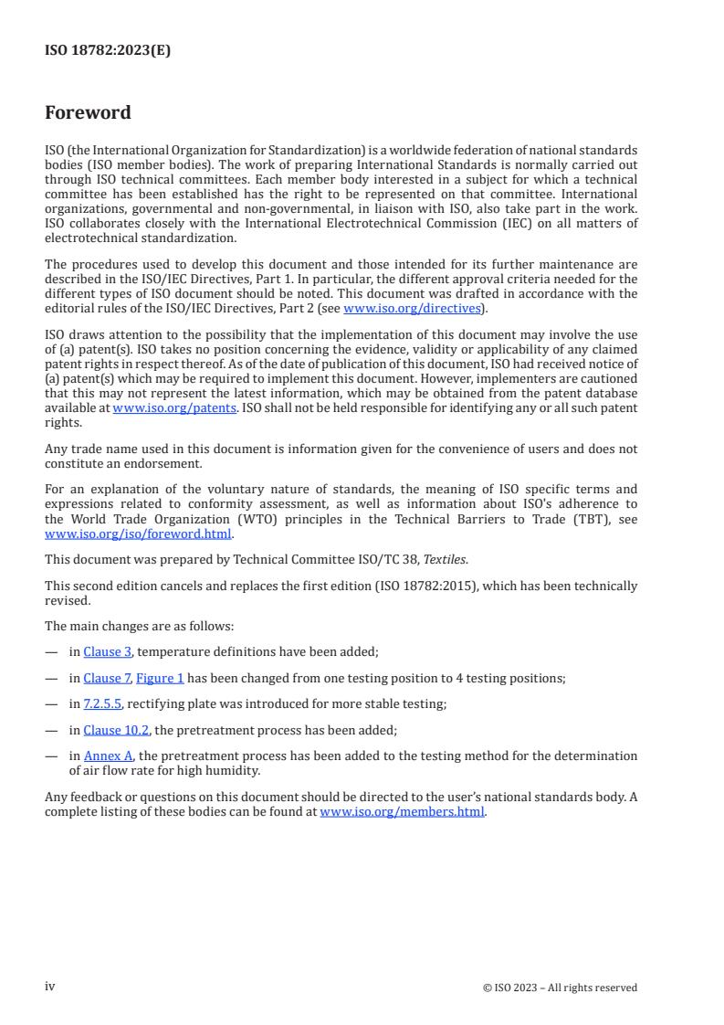 ISO 18782:2023 is a standard published by the International Organization for Standardization (ISO). Its full title is "Textiles - Determination of dynamic hygroscopic heat generation". This standard covers: This document specifies a test method for the determination of hygroscopic heat generated by flowing low to high humidity air on one side of a surface. It is applicable to all kinds of sheet-shaped textile materials.