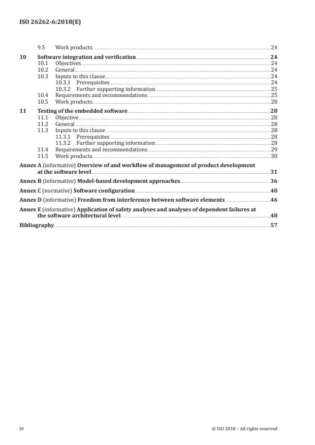 ISO 26262-6:2018 is a standard published by the International Organization for Standardization (ISO). Its full title is "Road vehicles — Functional safety — Part 6: Product development at the software level". This standard covers: This document is intended to be applied to safety-related systems that include one or more electrical and/or electronic (E/E) systems and that are installed in series production road vehicles, excluding mopeds. This document does not address unique E/E systems in special vehicles such as E/E systems designed for drivers with disabilities. NOTE Other dedicated application-specific safety standards exist and can complement the ISO 26262 series of standards or vice versa. Systems and their components released for production, or systems and their components already under development prior to the publication date of this document, are exempted from the scope of this edition. This document addresses alterations to existing systems and their components released for production prior to the publication of this document by tailoring the safety lifecycle depending on the alteration. This document addresses integration of existing systems not developed according to this document and systems developed according to this document by tailoring the safety lifecycle. This document addresses possible hazards caused by malfunctioning behaviour of safety-related E/E systems, including interaction of these systems. It does not address hazards related to electric shock, fire, smoke, heat, radiation, toxicity, flammability, reactivity, corrosion, release of energy and similar hazards, unless directly caused by malfunctioning behaviour of safety-related E/E systems. This document describes a framework for functional safety to assist the development of safety-related E/E systems. This framework is intended to be used to integrate functional safety activities into a company-specific development framework. Some requirements have a clear technical focus to implement functional safety into a product; others address the development process and can therefore be seen as process requirements in order to demonstrate the capability of an organization with respect to functional safety. This document does not address the nominal performance of E/E systems. This document specifies the requirements for product development at the software level for automotive applications, including the following: — general topics for product development at the software level; — specification of the software safety requirements; — software architectural design; — software unit design and implementation; — software unit verification; — software integration and verification; and — testing of the embedded software. It also specifies requirements associated with the use of configurable software. Annex A provides an overview on objectives, prerequisites and work products of this document.