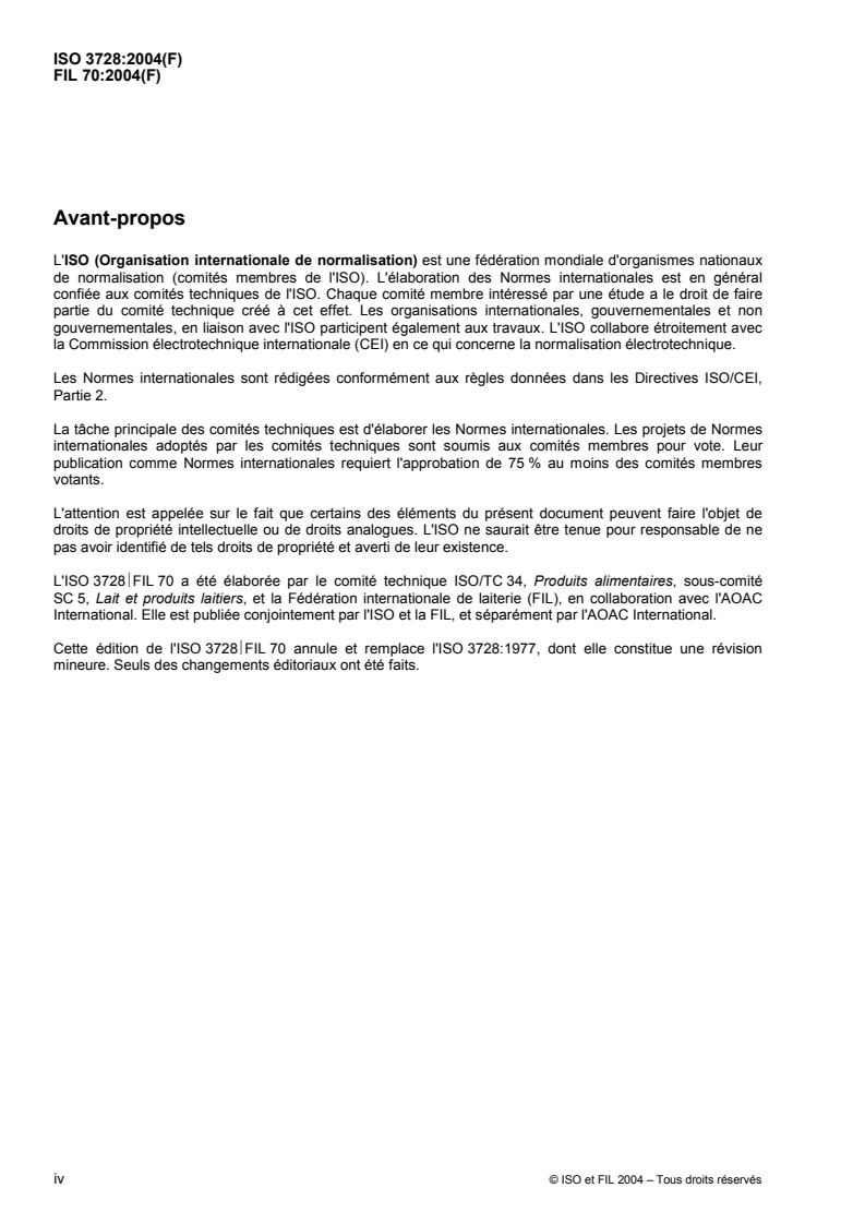 Cette édition de l'ISO 3728FIL 70 annule et remplace la FIL 70:1972. Seuls des changements éditoriaux ont