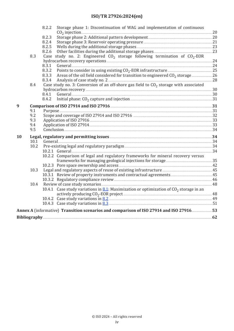 ISO/TR 27926:2024 is a technical report published by the International Organization for Standardization (ISO). Its full title is "Carbon dioxide capture, transportation and geological storage - Carbon dioxide enhanced oil recovery (CO2-EOR) - Transitioning from EOR to storage". This standard covers: This document examines various CO2 injection operations that involve modifications to CO2-EOR or other complementary hydrocarbon recovery operations that can be conducted in conjunction with CO2 storage. The document also examines potential policy, regulatory or standards development issues that can arise in evaluating such operational changes.