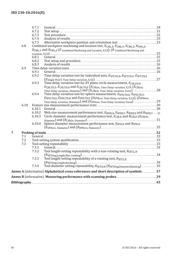 ISO 230-10:2016 is a standard published by the International Organization for Standardization (ISO). Its full title is "Test code for machine tools — Part 10: Determination of the measuring performance of probing systems of numerically controlled machine tools". This standard covers: ISO 230-10:2016 specifies test procedures to evaluate the measuring performance of contacting probing systems (used in a discrete-point probing mode) integrated with a numerically controlled machine tool. It does not include other types of probing systems, such as those used in scanning mode or non-contacting probing systems. The evaluation of the performance of the machine tool, used as a coordinate measuring machine (CMM), is outside the scope of this part of ISO 230. Such performance evaluation involves traceability issues, is strongly influenced by machine tool geometric accuracy and can, in addition to the machine tool probing system tests specified in this part of ISO 230, be evaluated according to ISO 10360‑2 and ISO 10360‑5. Numerically controlled machine tools can apply contacting probing systems in machining process applications, such as - identification that the correct workpiece has been loaded before machining, - location and/or alignment of the workpiece, - measurement of the workpiece after machining, but while still on the machine, - measurement of the position and orientation of the machine tool rotary axes, - measurement and setting of the cutting tool (radius, length and offset of the tool), and - detection of tool breakage. NOTE 1 This part of ISO 230 focuses on machining centres, but it is intended that other types of machines, for instance turning and grinding centres, be included in a future revision of this part of ISO 230. NOTE 2 This part of ISO 230 does not include non-contacting type of probes (e.g. optical probes), but it is intended that they be included in a future revision of this part of ISO 230.