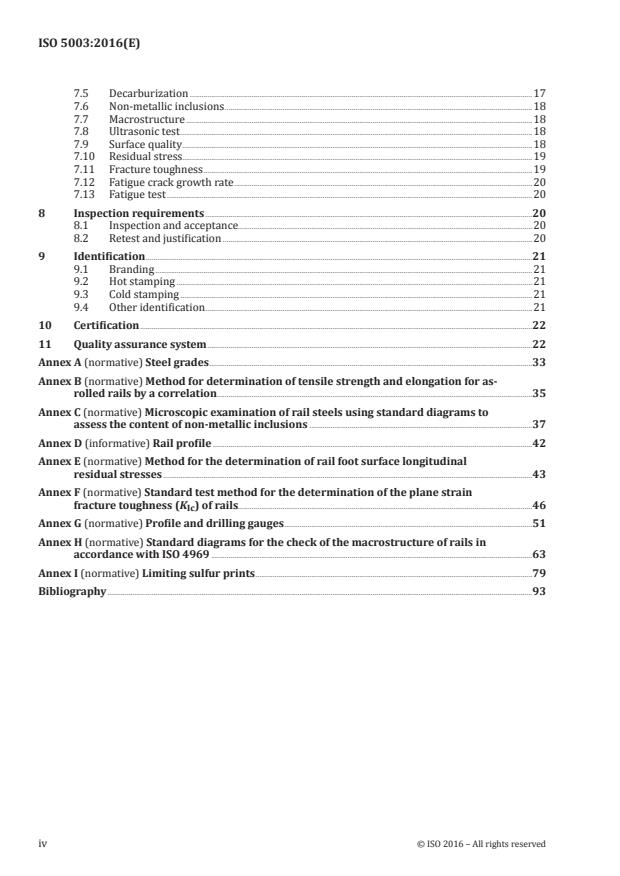 ISO 5003:2016 specifies the terms and definitions, information to be supplied by the purchaser, tolerances for dimensions, length, technical requirements, inspection rules, identification, certification, and a quality assurance system for as-rolled and heat-treated steel rails for railways. ISO 5003:2016 specifies flat bottom (vignole) railway rails with linear mass of 43 kg/m and above, for conventional and high-speed railway track usage. There are 19 pearlitic steel grades specified, covering a 200 HBW to 400 HBW hardness range and including "non-heat-treated" carbon manganese steels, "non-heat-treated" alloy steels, "heat-treated" carbon manganese, and "heat-treated" low alloy steels.