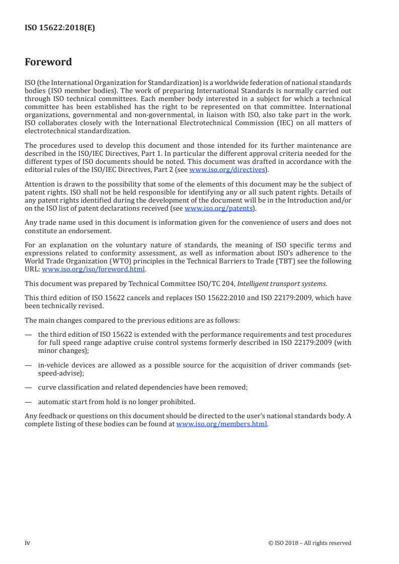 This document contains the basic control strategy, minimum functionality requirements, basic driver interface elements, minimum requirements for diagnostics and reaction to failure, and performance test procedures for Adaptive Cruise Control (ACC) systems. ACC systems are realised as either Full Speed Range Adaptive Cruise Control (FSRA) systems or Limited Speed Range Adaptive Cruise Control (LSRA) systems. LSRA systems are further distinguished into two types, requiring manual or automatic clutch. Adaptive Cruise Control is fundamentally intended to provide longitudinal control of equipped vehicles while travelling on highways (roads where non-motorized vehicles and pedestrians are prohibited) under free-flowing and for FSRA-type systems also for congested traffic conditions. ACC can be augmented with other capabilities, such as forward obstacle warning. For FSRA-type systems the system will attempt to stop behind an already tracked vehicle within its limited deceleration capabilities and will be able to start again after the driver has input a request to the system to resume the journey from standstill. The system is not required to react to stationary or slow moving objects
