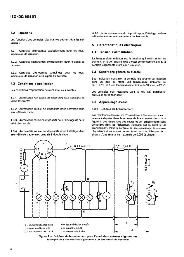 ISO 4082:1981 is a standard published by the International Organization for Standardization (ISO). Its full title is "Road vehicles — Motor vehicles — Flasher units". This standard covers: Defines the electrical characteristics with which flasher units shall comply when submitted for acceptance. Applies to flashers intended for use on motor vehicles with 12 V or 24 V systems, which may or may not be equipped for a towed vehicle. Can be applied to motorcycles. Not applicable to two-level luminous intensity devices.