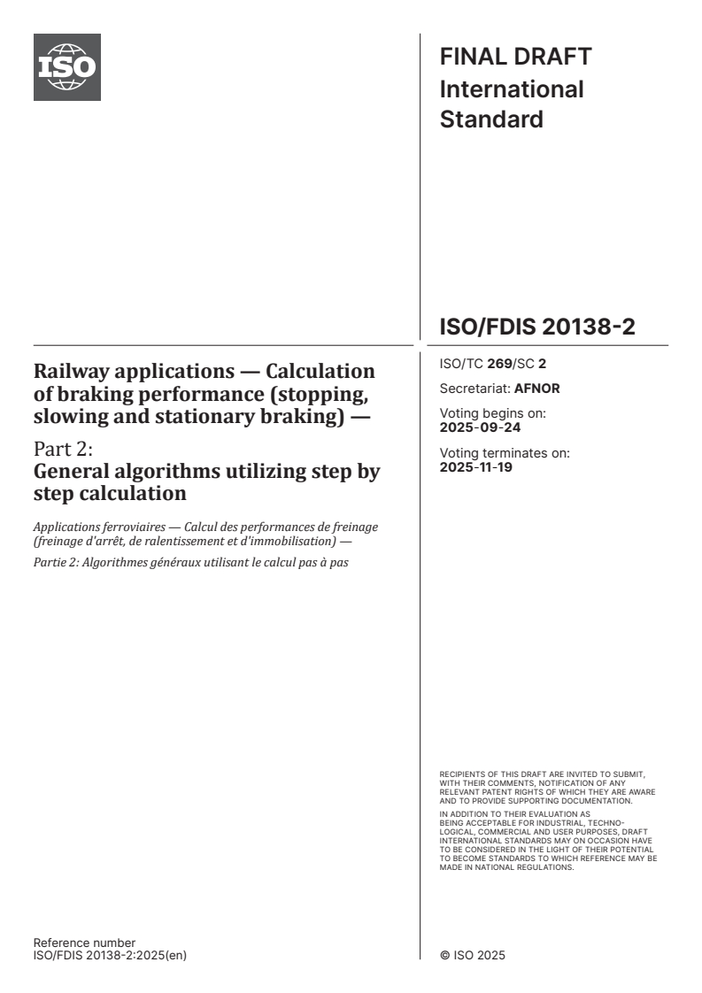 ISO 20138-2 - Applications ferroviaires — Calcul des performances de freinage (freinage d'arrêt, de ralentissement et d'immobilisation) — Partie 2: Algorithmes généraux utilisant le calcul pas à pas/22/2025