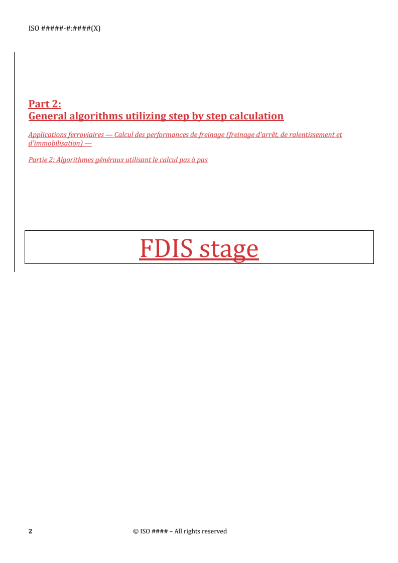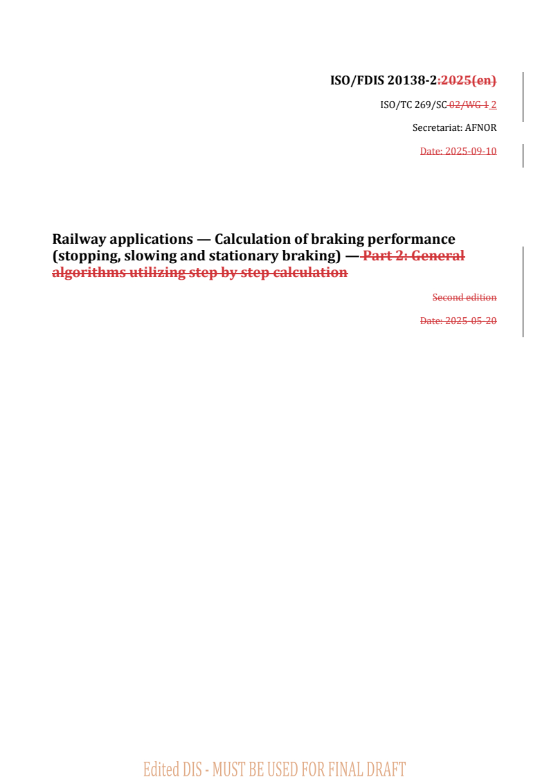 REDLINE ISO/FDIS 20138-2 - Railway applications — Calculation of braking performance (stopping, slowing and stationary braking) — Part 2: General algorithms utilizing step by step calculation Released:10. 09. 2025